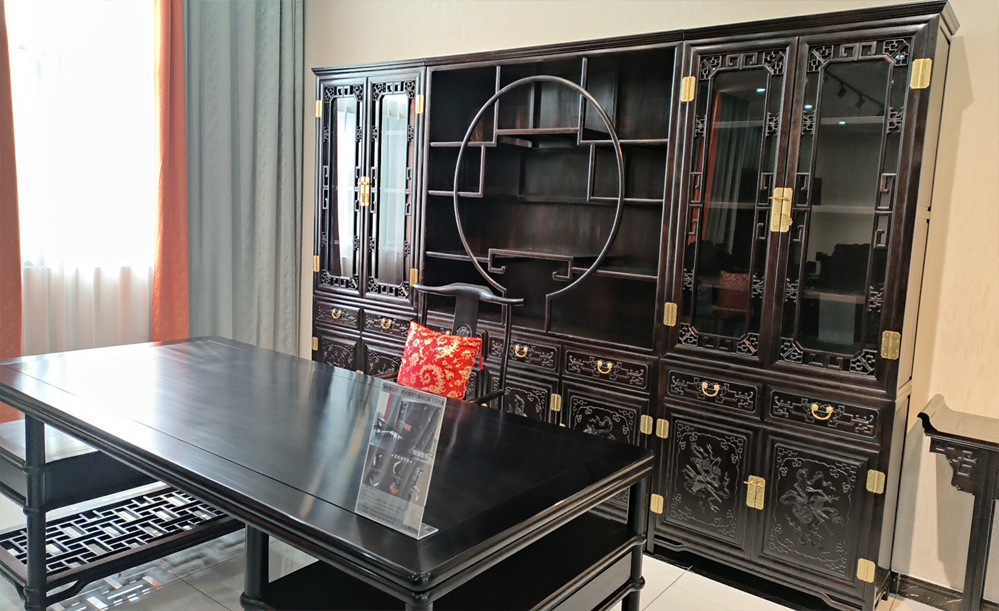 江蘇中尊木業(yè)有限公司書(shū)房系列產(chǎn)品:書(shū)房五件套草龍書(shū)柜、草龍大班枱、卷書(shū)寶座椅,洋花寫(xiě)字枱等。